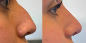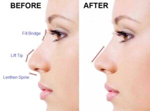 شرح الطريقة: في هذه الطريقة، يتم استخدام مواد مالئة تعتمد على حمض الهيالورونيك أو هيدروكسي أباتيت الكالسيوم لتعديل شكل الأنف. يقوم الطبيب المتخصص بحقن الفيلر بدقة في مناطق معينة من الأنف، مما يمكن أن يعالج العيوب الظاهرية مثل حدبة الأنف، أو عدم التناسق، أو تدلي طرف الأنف.
